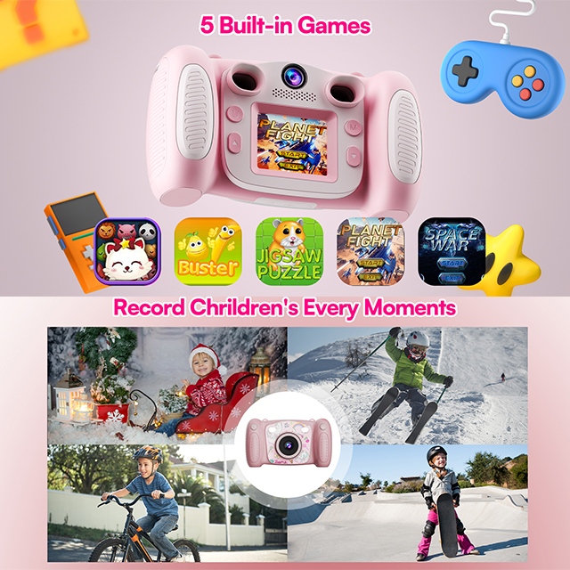 The camera comes with a real-time viewfinder screen, so it’s easy to take both photos and videos. It also supports MP3 playback and includes built-in games for extra fun during downtime, making it a fun gift for kids.