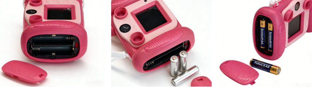 Our new kids digital camera uses 4 AA batteries, which can be easily replaced with standard batteries available on the market, making it EU-friendly. It is designed like a game controller. The sides are comfortable to hold and also house the battery compartment.
